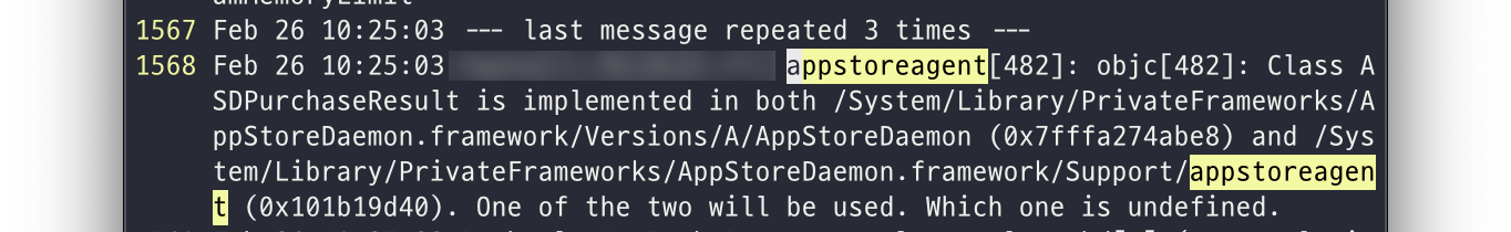 사실 이 문제는 다름아닌 Appstore 가 구동 될 때 함께 sideload 되는 AppstoreAgent 라는 프로세스가 문제의 원인 입니다. /var/log/system.log 를 보면 아래처럼 두군데에서 ASDPurchaseResult API 를 상속 받았는데, 한군데는 이 기능이 없다고 나옵니다. 정말 소프트웨어 대가들 답게 품질이 대단 합니다. 여러모로.
