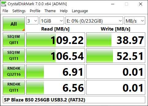 이전 SP Blaze B50 64GB 제품을 나름 써멀 처리 했을 경우 4K 성능이 조금 나아나지는 수준 이었던 지라 꽤 저렴하게 판매 중인 이 256GB 제품은 어떨까? 라는 의문으로 64GB 보다 약 약 2.8 배 가격으로 구매 해 보았습니다. 패키지가 64GB 제품과 달리 이건 또 USB3.2 Gen1 이라고 되어 있는데 대체 이 관점이 뭔지는 도통 모르겠지만 대충 그냥 USB3.0 이란걸 어렵게 써 대는거 말고는 잘 모르겠다 싶습니다.
