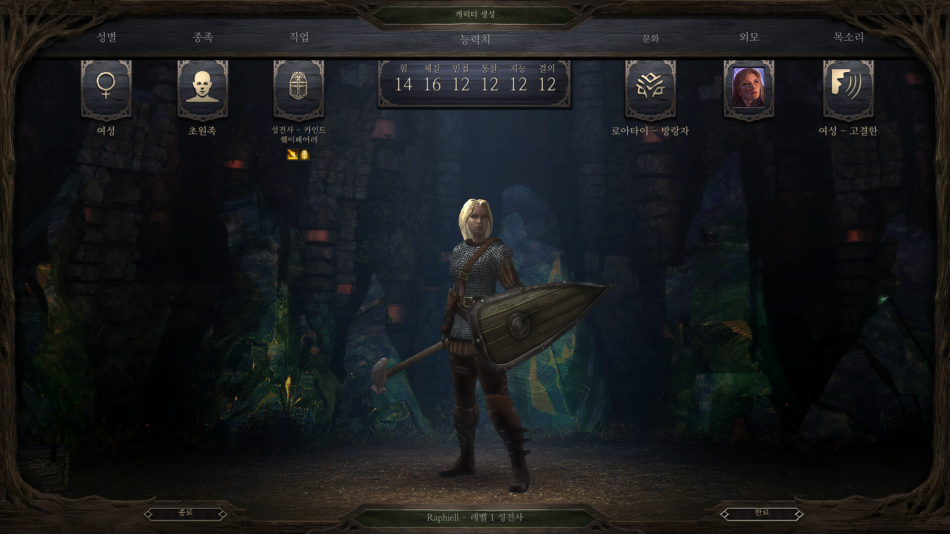 처음 플레이는 남성 기사, 이번은 여성 성기사로 시작을 합니다. 다행이 이 게임은 성별에 따른 각 능력치 차이가 1도 없는 아주 올바르게 어려운 게임이기 때문에 게임중 호칭 ( 여성일 경우 결혼도 안한 캐릭터에게 '부인' 이란 호칭을 붙입니다... ?? ) 과 약간의 대사 차이점 등이 존재 합니다.