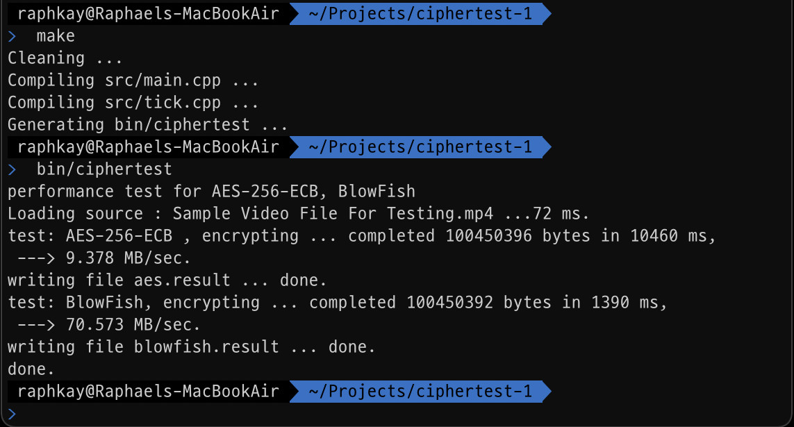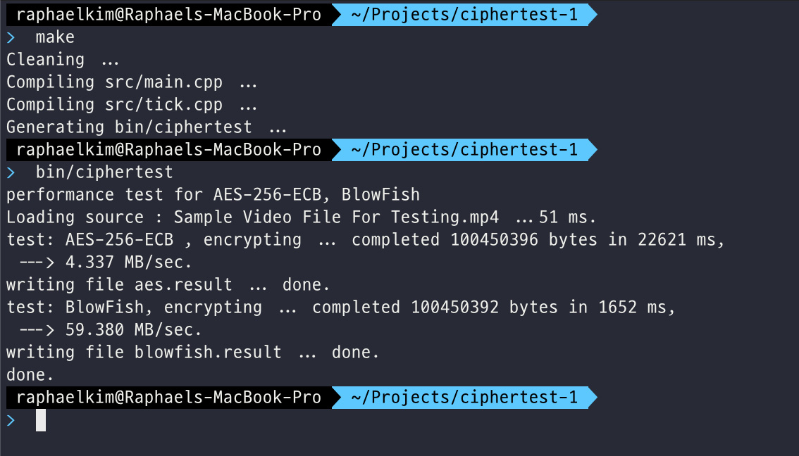 그간 libEndeTool 이라는 라이브러리를 OpenSource 로 AES-256-CBC 와 BASE64 를 통한 테스트기반으롤 저장하는 간편한 기능을 사용하고 있었는데, 이 라이브러리의 단점은 대용량 파일 처리가 느리다는 점 입니다. 아마 모든 AES 알고리즘 기반 암호화 알고리즘의 단점일 수 있겠지만, 문제는 느리다는 이유가 바로 키 길이에 따라 발생하는 패턴을 없애기 위해 CBC 를 처리하고 있다는 점 입니다. 이 CBC 가 전체적인 성능을 모두 까먹고 있는 것이고, 만약 이 CBC 대신 가장 기본적인 알고리즘 만으로 데이터를 짧게 처리해서 패킷 단위로 나눠 매번 키를 다르게 해서 처리 한다는 가정으로 과연 이 AES 와 BlowFish 간의 데이터 성능 차이는 얼마나 날까? 라는 의문을 기반으로 실험을 진행 해 보기로 했습니다.