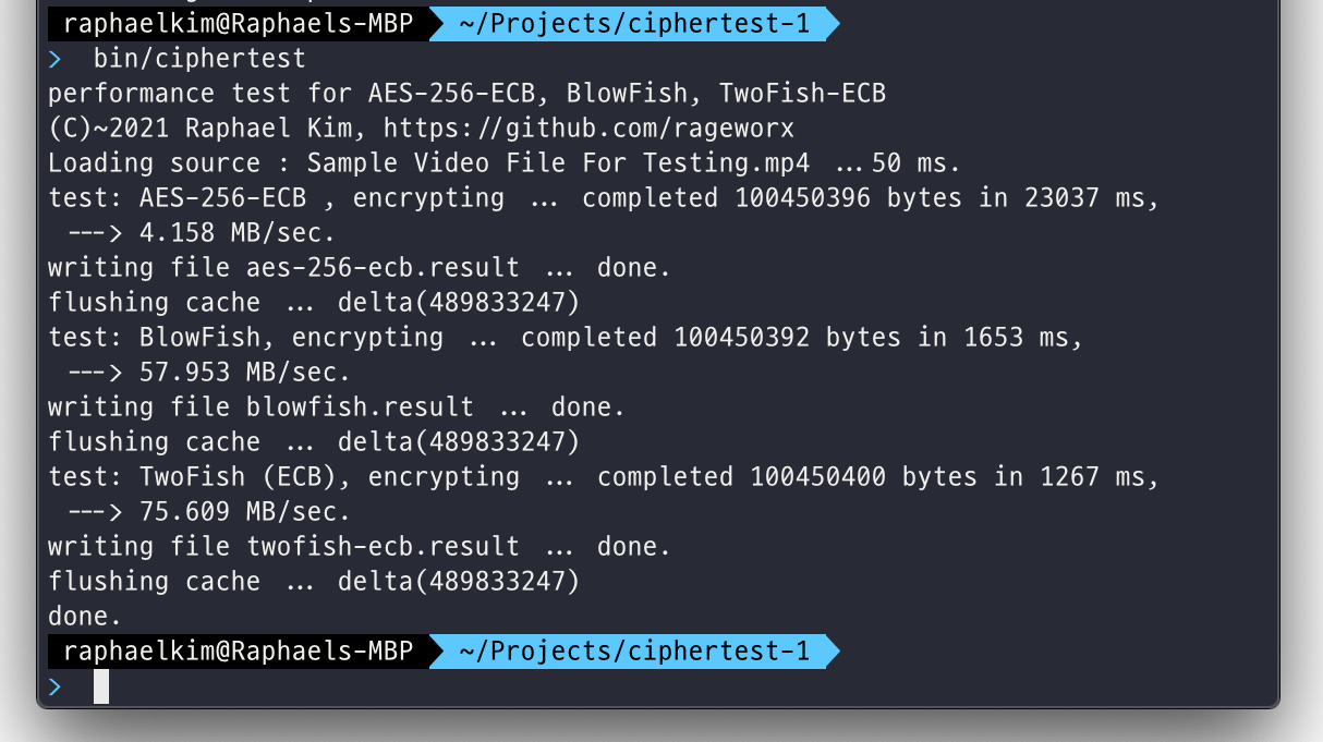 이전 CipherTest-1 으로 부터 속도 계산 방법이 잘못 된 것을 알아서 정확히 속도 계산을 하도록 했으며, 각 암호화 작업 이후에 delta 를 계산하는 형태로 만들어 CPU 의 cache 에 영향을 받지 않도록 처리 해 두었습니다. 이런 저런 이유로도 지금 계획중인 USB3 의 5Gbps 내 packet 을 암호화 처리 하는데 있어서 TwoFish 는 가장 우선적인 암호화 방법이라 봐 집니다. 물론 암호화 특성 때문에 각기 데이터 크기가 조금씩 다르게 나오는데, 속도와 최종 8 바이트 정도는 어느정도 양해를 구해도 될 정도 이니, 꽤 나쁘지 않은 가장 빠른 암호화 알고리즘이 아닌가 합니다.