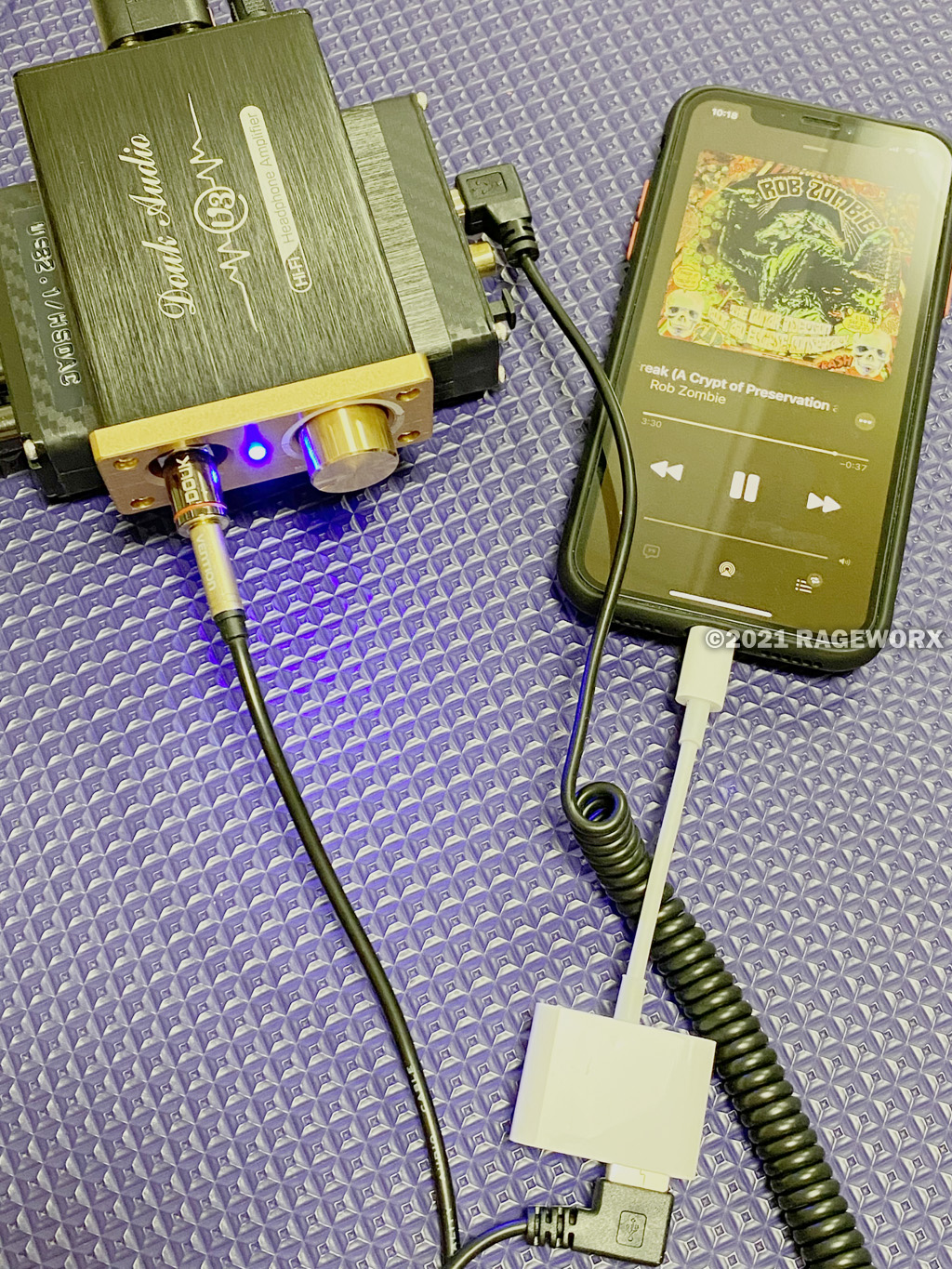 그럼 어디에 연결을 하는가? 하고 하면 이 제품은 RCA 입력을 증폭만 하기 때문에 일반 DAC 나 3.5mm 출력이 있는 기기에 연결을 해야 한다는 말이 되며, 아래와 같이 아이폰 -> DAC -> v3 로 연결되는 구성을 해서 엄청나게 풍부한 음량으로 디테일 까지 모드 들어 줄 수 있는 즐거움을 만끽할수도,