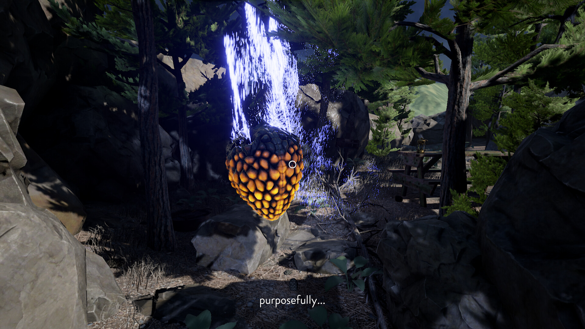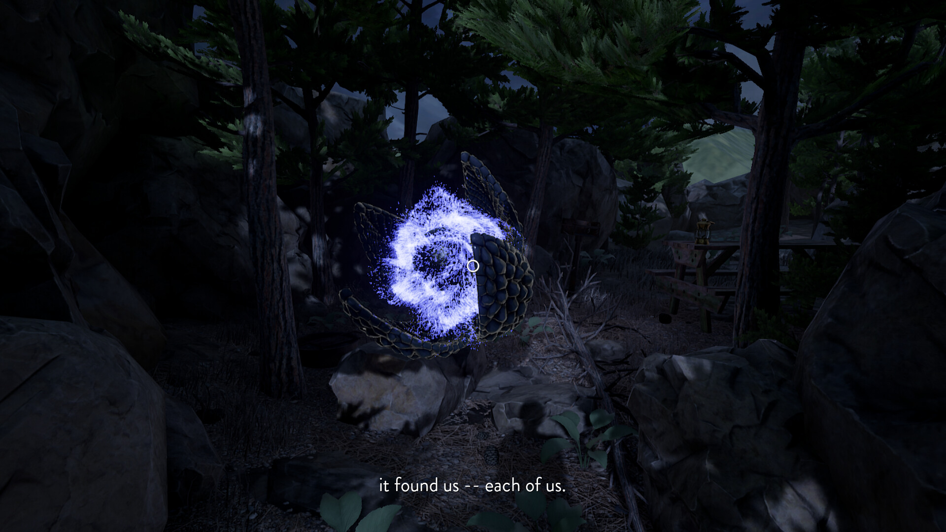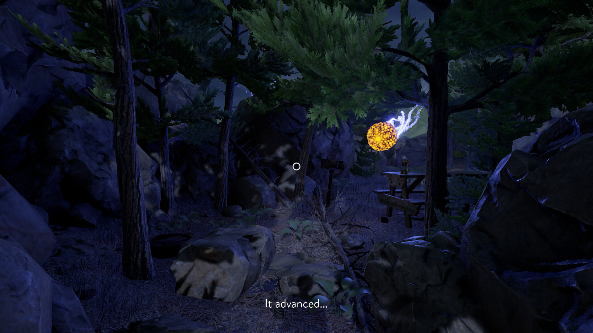우주의 뭔가가 빛을 원형으로 내뱉은 다음 정신을 차려 보면 같은 장소였으나 이미 다른 곳에 와 있음을 알 수 있습니다. 오른쪽에 보이던 벤치와 거기에 있는 랜턴, 그리고 주변의 소나무들 ... 모든 것이 이상한 동굴 안에서 시작되는 현상 외엔 그대로 인 것처럼 보입니다.