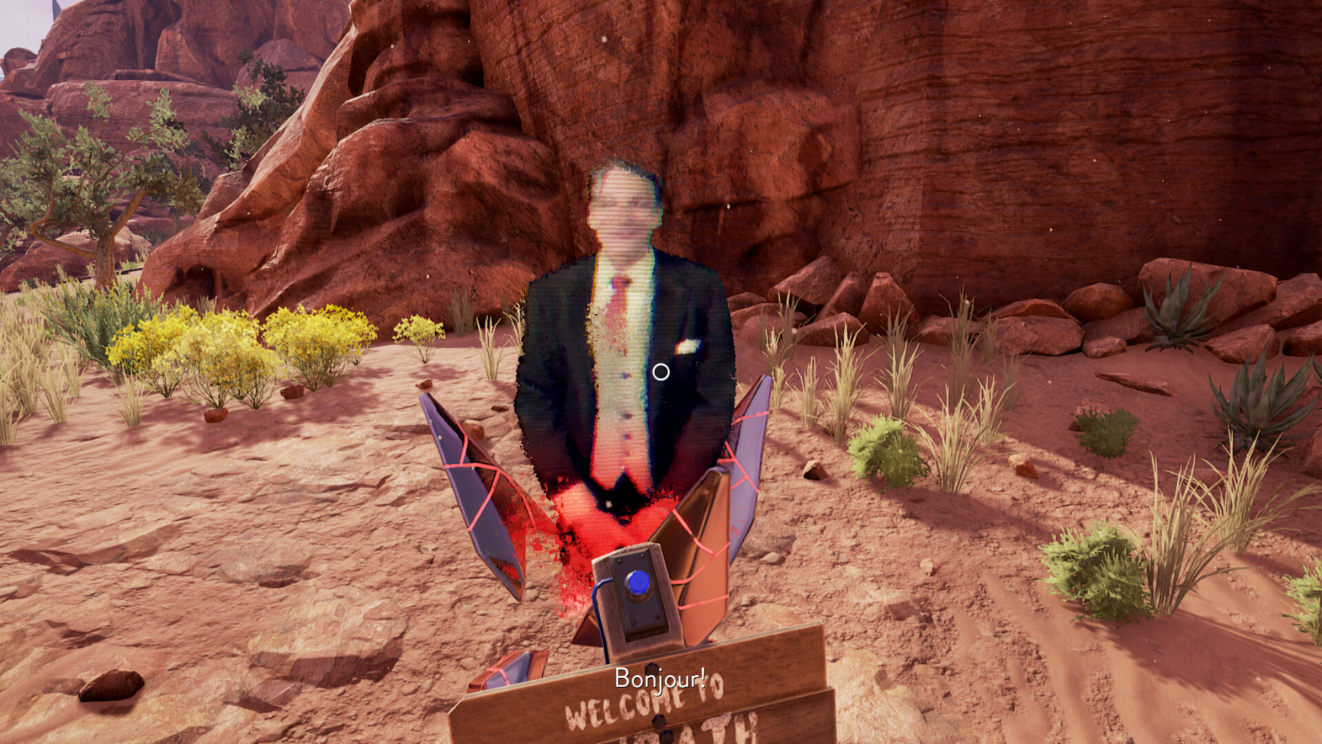 타이어 휠 위에 스피커와 VHS 비디오 플레이어, 그리고 이상하게 떠다니는 돌 앞에 훈라스에 온걸 환영한다 라는 글귀 그리고 그 위에 버튼을 누르면 나타나는 시장이란 양반의 이상한 2D 비디오 영상...
