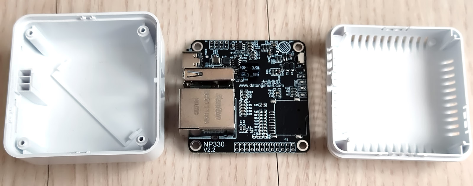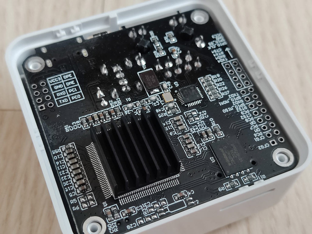 PCB는 검은색 도료를 사용했고, 사용한 AP는 대만 Nuvoton 사의 NUC980 DK61 YC를 사용하였습니다. 이거 용도 자체가 IoT 기기들을 위한 저성능 ARM928E 32bit 제품으로서 Embedded Linux kernel 3.4.x 대가 들어가는 좀 오래된 제품입니다. 딱히 성능이 그리 좋다고는 할 수 없는 만큼 제품 자체 성능도 그리 아름다운 기능들을 기대하기엔 곤란한 수준입니다. 프린터 연결해서 쓰라고 만든 제품에 뭘 자꾸 기대하면 곤란하다는 것을 다시 상기하게 됩니다만, 기판을 잘 보면 하나의 PCB에 뭔가 확장은 잘하도록 해 두었습니다. SPIO 가 그대로 노출되어 있고 ( 아마 이 부분이 WiFi 나 BT 모듈이 붙은 제품에 사용되는 IO 일 것으로 보입니다 ) 디버깅을 할 수 있는 시리얼 포트도 그대로 단자만 달면 kernel 메시지를 확인해 볼 수 있을 듯합니다 - 만 귀찮아서 그런 거 까지는 하지 않겠습니다. 눈이 침침해서 요즘 이 정도 크기의 PCB 도 땜질하려면 힘듭니다.