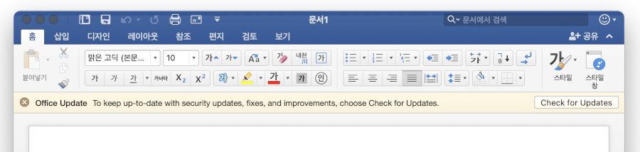 2017 년인가 구매했던 MS Office 2016 MacOS 버전을 두대의 MacBook 에서 사용하면서 계속 눈에 거슬리는 것 하나가 바로 "더 이상 업데이트 안 해 준다는 협박"입니다. 웃긴 건 업데이트를 더 이상 안 해 준다면서 계속 업데이트가 있다면서 뜨면서 Office 365를 사던지 Office 2019를 사던지 하라는 협박성 노란색 알림 바가 아래 이미지처럼 뜬다는 점입니다.