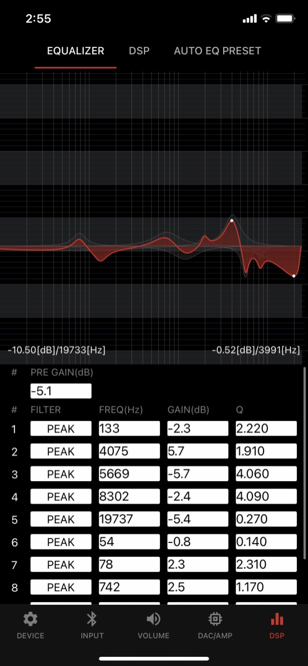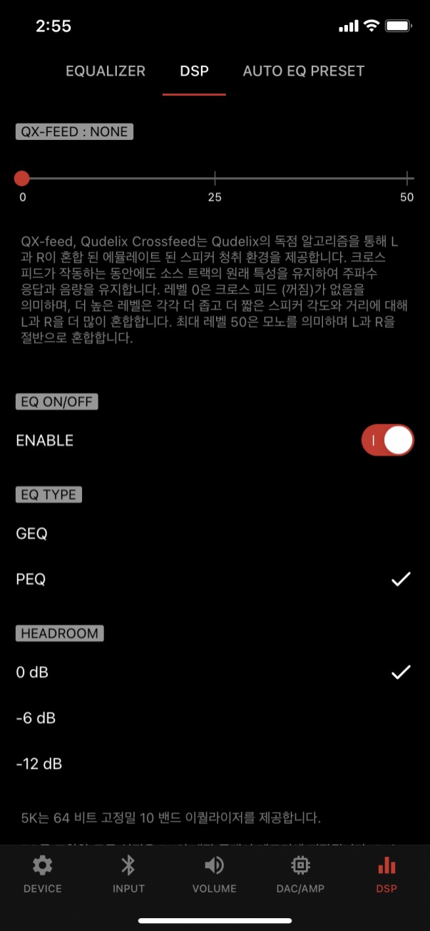 일단 가장 최근에 나왔고, 가장 진보적인 성능과 기능을 모두 가진 큐델릭스5K 가 배터리 시간을 제외하고는 가장 좋은 품질을 자랑했습니다. 특히 기본으로 쓸 때는 모르는 아이폰 전용 앱을 써 보면 그 모든 점들이 다르게 보이게 되는 장점이 있으며, 기본적인 EQ 가 없이 사용하는 상태에서도 충분히 큐델릭스5K 는 가장 좋은 소리를 들려주었습니다. 최대 96KHz를 지원한다 한들 사실 사용되는 헤드폰들이 최대 스펙이 44KHz 인 제품들이기 때문에 HiRes 와는 거리가 멀었습니다.