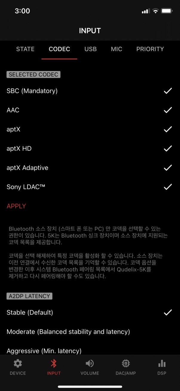 큐델릭스를 높게 사고 싶은 부분 중 하나가 정말 너무하다 싶을 만큼 업데이트가 많은 부분들인데 보통 이중 모 회사와 비교될 수준으로 펌웨어 부분이 강력합니다. 이 펌웨어 업데이트들은 버그를 수정하는 것도 있겠지만, 점점 더 기기 성능을 향상하고 호환성을 높이고 있다는 부분을 업데이트 이력에서 확인할 수 있도록 앱에서 제공해 주고 있습니다. Rad**one 같은 회사와 매우 상반되는 모습입니다. 게다가 제품에서 지원하는 CODEC에 대해 다음과 같이 보여주는 것 외에도 이를 사용자가 일일이 조정할 수도 있는 듣지도 보지도 못한 기능까지 지원하는 건 아마 이쪽 분야에서 끝판왕이 아닐까 합니다.