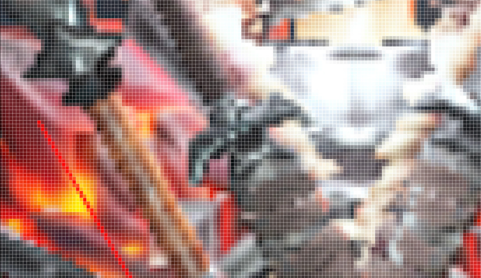 위 이미지에 가운데 부분을 다시 잘라 포토샵으로 확대해 봤을 때 각 픽셀에 해당하는 칸들에 정확히 1:1로 픽셀이 들어가 있지 않고, 2~3 칸씩 붙여 있는 부분과, 왼쪽 편에 손잡이 부분과 빨간색 선을 그려서 대조한 픽셀 구성만 봐도 얼마나 디테일에 큰 차이가 있는지 확인이 되는 부분입니다.