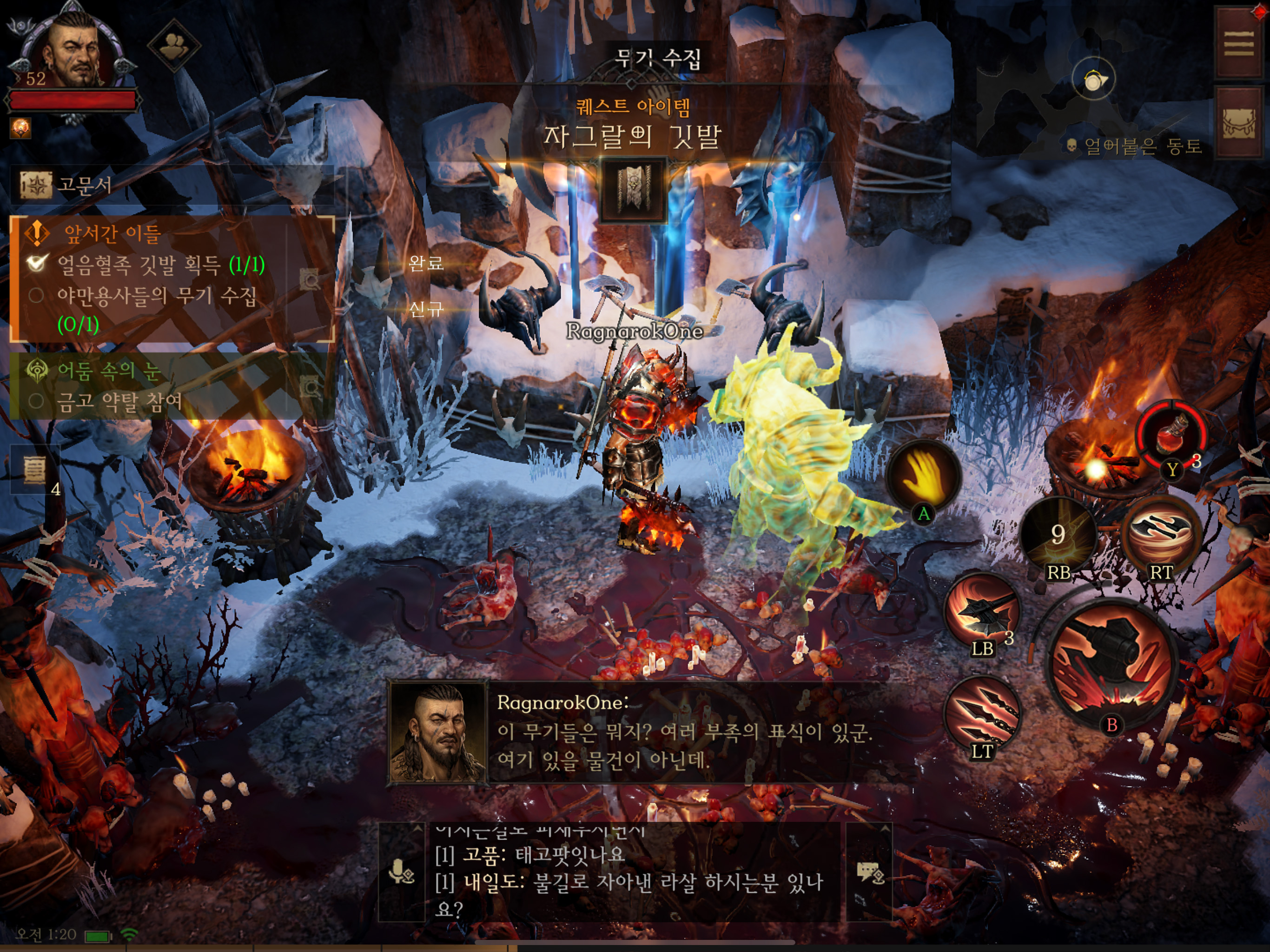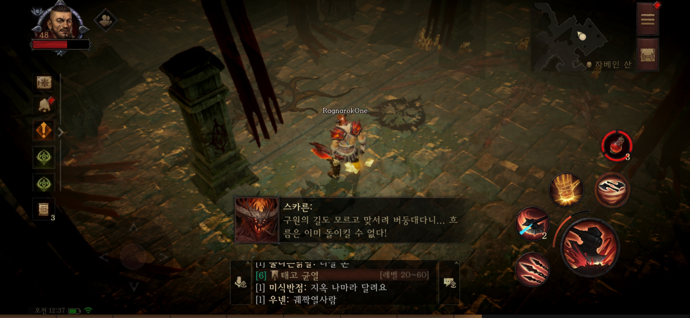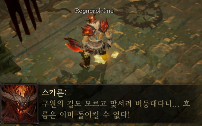 대부분 디아블로를 해 본 사람들이라면 동일하게 느끼는 부분이긴 하겠습니다만, 정통 디아블로 시리즈가 가지는 모습들과는 확연히 다릅니다. 물론 좋아진 부분은 100% 한글화는 물론 우리말 성우까지 호화판임은 분명 하나, 집에서 싱글 플레이를 따로 PC에서 하던 사람 입장에서는 필드에서 NPC와 대화를 읽고 듣는 중 몹들에 의해 방해받아 집중하던 스토리에 찬물을 계소 끼얹고 있는 것들이나, 스토리상 다른 사용자들이 없어야 할 부분에 계속 나타는 부분들이 스토리에 집중하지 못하게 하는 단점이기도 합니다. 물론 소가 득실대는 그곳이 없는 것도 한몫을 했을지도 모르겠으나, 모바일 기기에 최적화된 조건으로 PC까지 이를 적용하다 보니 당연히 기존 디아블로와 다를 수밖에 없습니다.
