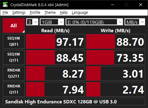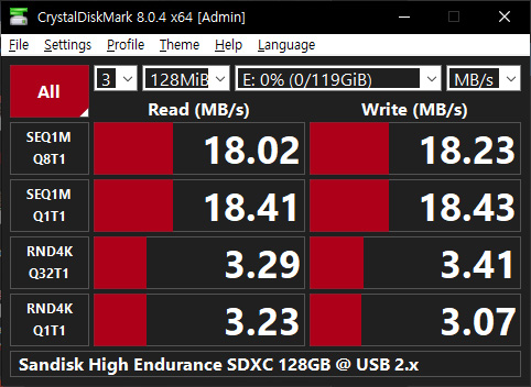 sdio 성능이 처참한 USB 2.0 리더기들에서는 성능을 기대하기가 어려울 듯합니다만, 4K 쓰기 접근 속도는 USB 3 나 USB 2 나 차이가 많지는 않은 듯합니다. (읽기는 비교 불가)