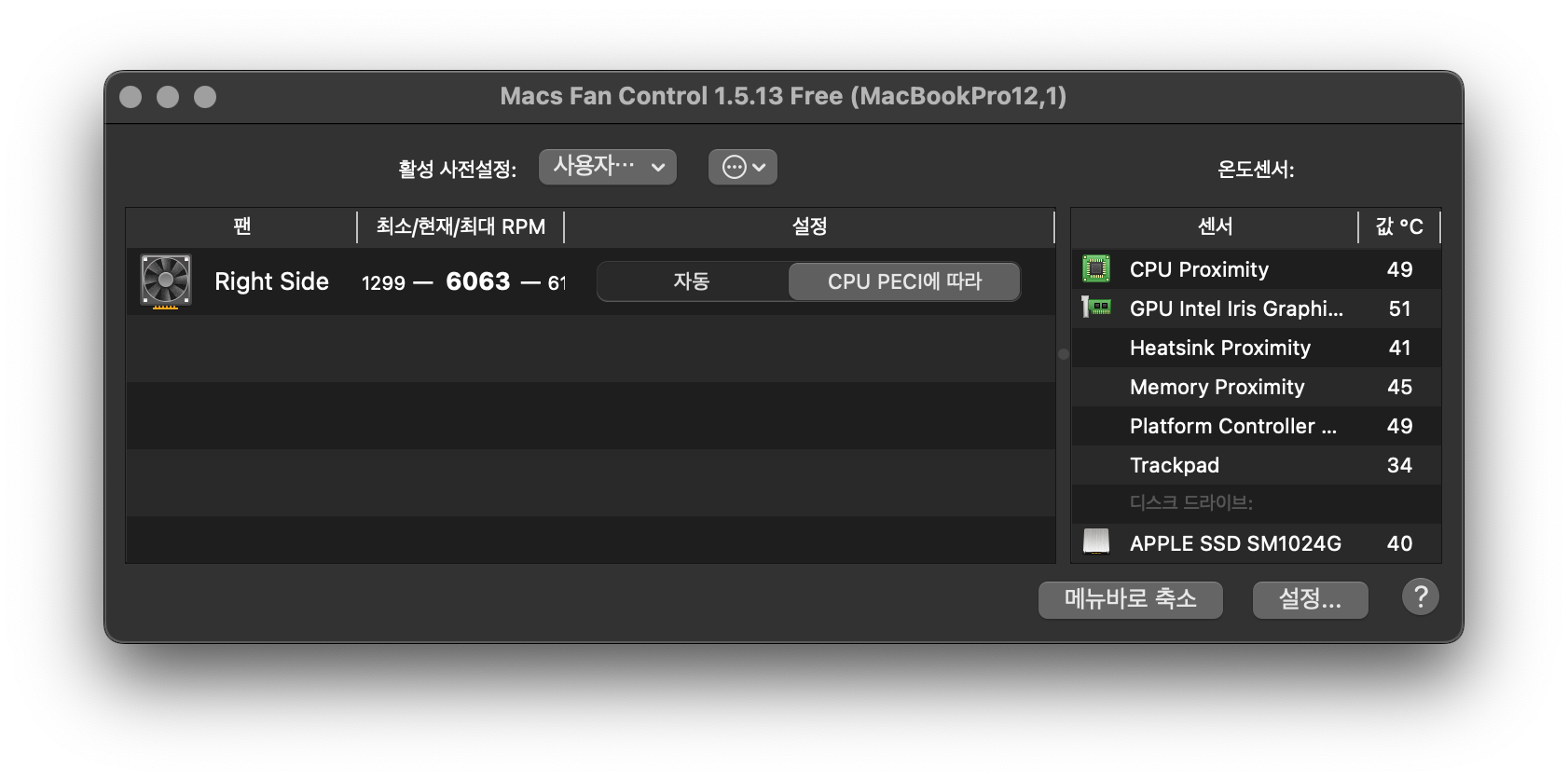맥북프로 13" 2015 는 여러 실험을 통해 설정에서 그리 많은걸 할 게 없었습니다. 단순히 쿨링팬 속도 기준을 CPU PECI에 맞추고, 온도 설정을 다음 42~60도 정도로 해 주면...