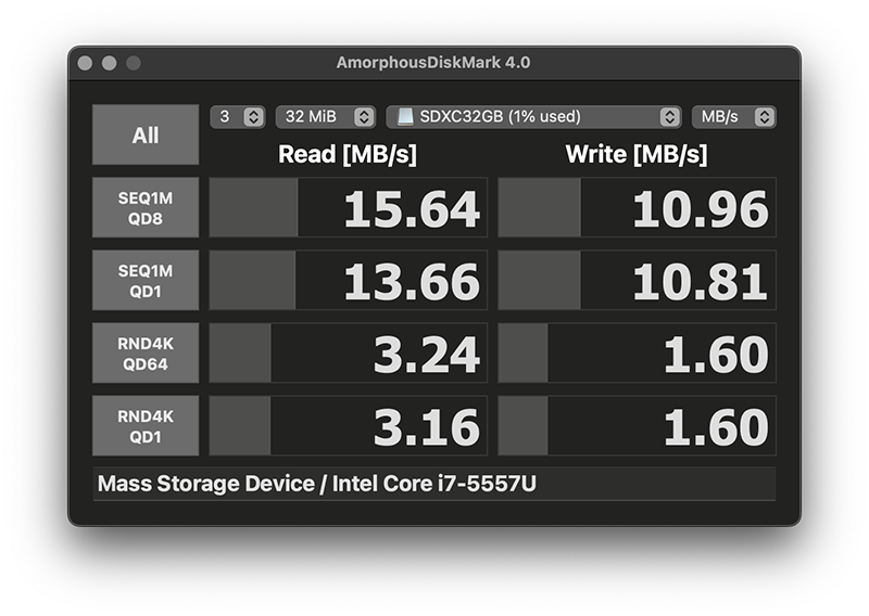쓰기 속도 60MB/s 정도 나오는 micro SD 가 10 MB/s 나오는 경이적인 성능을 보여 줍니다. 읽기는 80MB/s 정도 나오는 속도에 15MB/s이라는 대략 1/6 정도 다 까먹고 동작하는 경이로움을 선사해 줍니다. 과연 이 성능으로 32GB 제품을 채운다면 얼마나 오래 걸릴까..라는 생각이 먼저 들긴 합니다만, USB 2.0 에다가 그냥 내구성이 좋을 것이라는 기대만으로 쓸 제품이다 보니 성능을 논하지는 말아야겠습니다.