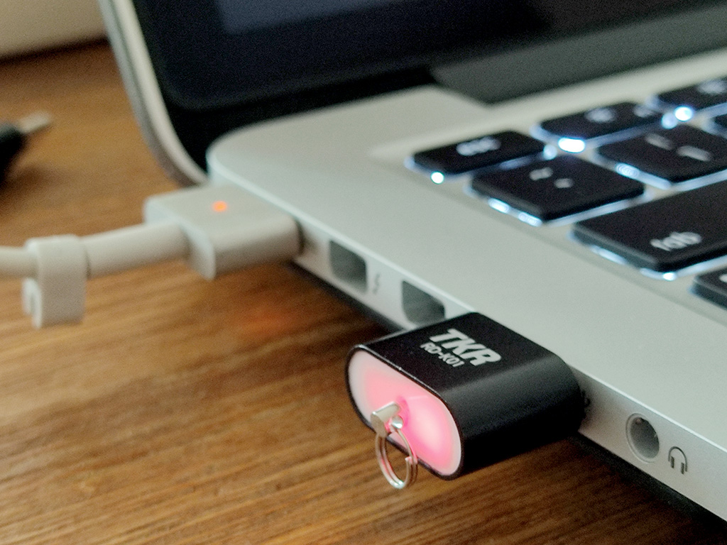 맥북에 연결하면 이렇게 USB-A에 딱 맞는 구조이며, 동작중일 때 빨간색 LED 가 점멸하여 이를 시각적으로 쉽게 알 수 있도록 해 줍니다. 성능은 과연 어떨지, 하고 보면...