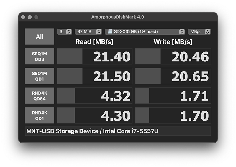실제 USB IF descriptor 내에서는 원래 제조사에서 정한 장치 이름인 MXT-USB Storage Device 로 인식하며, USB3.x 에서는 읽기 80MB/s에서 쓰기 60MB/s 나오는 제품이 최대 20MB/s으로 USB 2.x 제품군 중 가장 잘 나오는 측정치를 보여 준다는 점입니다. 특히 안드로이드 기기에 연결해서 바로 확인할 때 가장 편리한 용이성을 보여 주며, 이때 micro SD는 64GB 이상인 제품일 경우 exFAT 또는 vFAT (FAT32)로 포맷되어 있으면 다양한 기기에서 읽고 쓰기에 용이합니다.