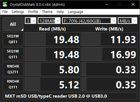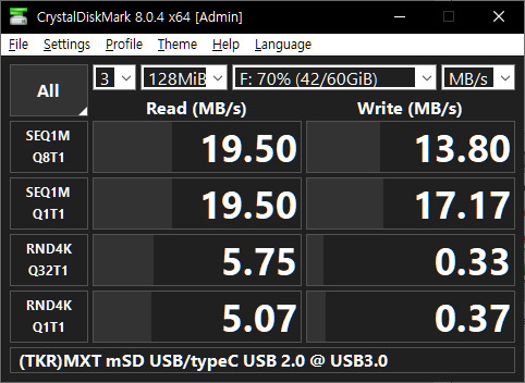 같은 MXT 제품이나, 무슨 차이가 있는지 이전에 쓰던 제품 대비 연속 쓰기에서는 조금 더 잘 나옵니다. 이게 무슨 의미가 있을지는 크게 와닿지는 않지만 아마 테스트 때마다 발생하는 여러 우연의 조건중 하나가 아닐까 합니다만, 얼추 연속 쓰기 Q8T1 에서는 14MB/s 보다 못하고, Q1T1 에서는 17MB/s 정도 나온다 생각하시면 됩니다.