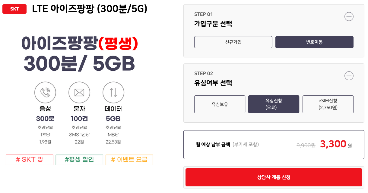 무려 평생 3,300 원에 음성 300분에 문자 100건, 데이터는 5GB를 사용할 수 있지만 통신사가 SKT 망을 사용하는 제품으로, 사람에 따라 기피할 수 있을 조건이지만 정말 괜찮은 조건의 상품이기도 합니다. 물론 글을 쓰고 있는 이 시점에서 그간 2년 넘게 쓴 LG U+ GS25 요금제로 시작했던 요금제를 바로 갈아타고 난 뒤기도 합니다. 물론 이 경우 사용하는 제품이 아이폰을 사용하는 경우가 아니라면 VoLTE를 사용하기 어렵다는 조건이 있어, 다소 까다롭긴 합니다.