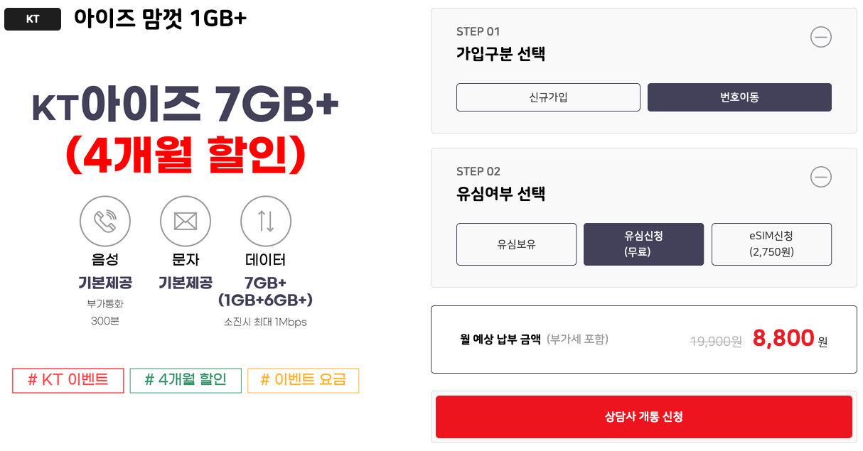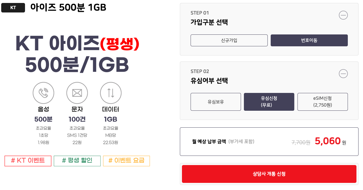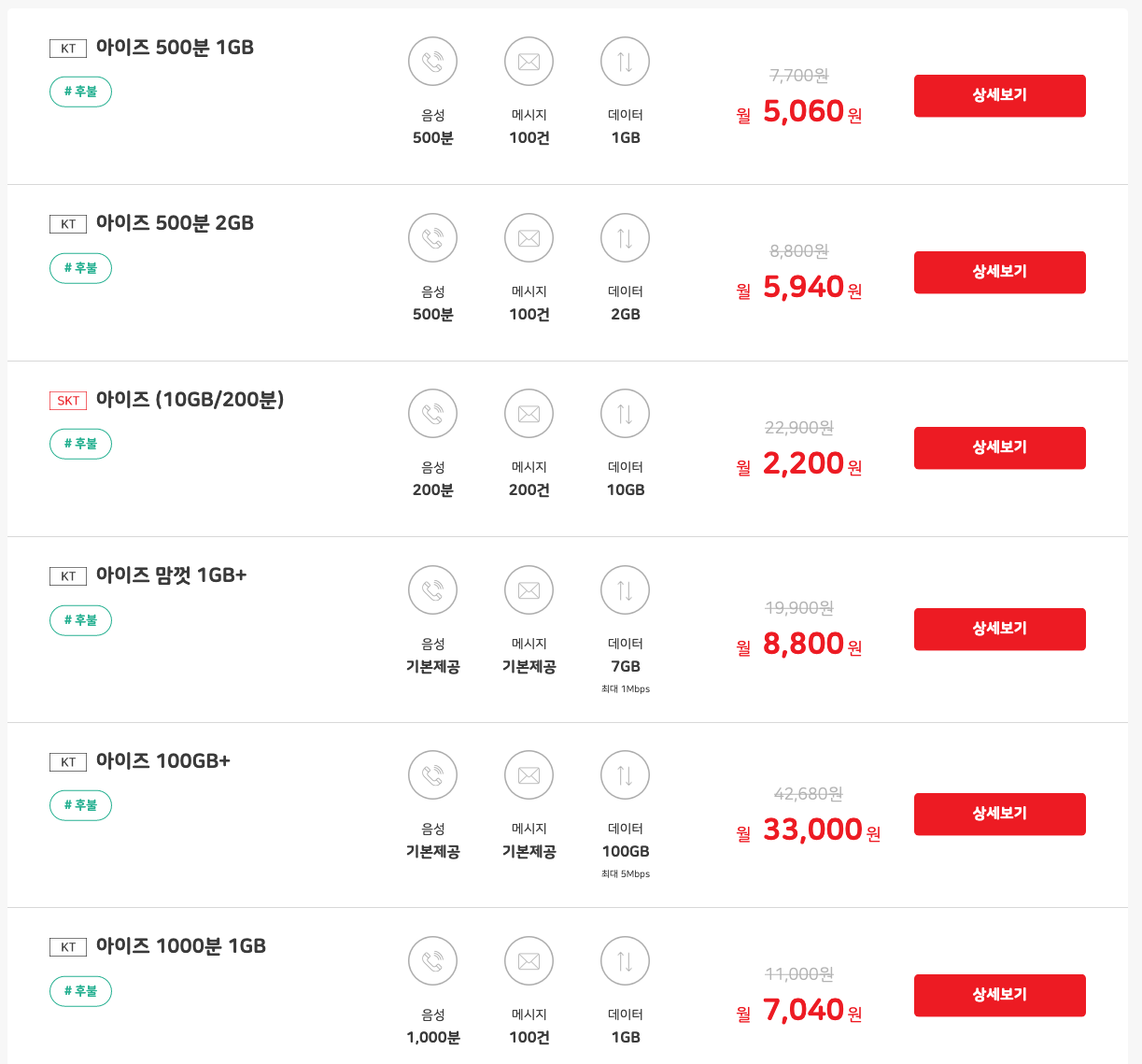그렇다고 이런 기간 할인만 하는 것은 절대 아닙니다, 제일 처음 있는 KT 아이즈 500분/1GB(+문자 100건)의 경우 원래 7,700 원인데 평생 할인으로 5,060 원이란 가격으로 쓸 수 있습니다. 매일같이 집에 있으며 WiFi만 사용하며, 가끔 집 밖을 나가서 간단한 데이터 사용만 할 사람이라면 이런 요즘 커피 한잔 값으로 사용이 가능한 요금제 가입이 가능합니다.
