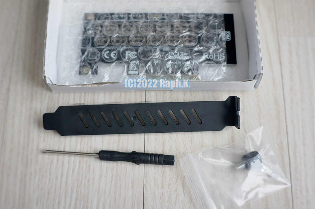 박스 안에는 NVMe SSD를 장착할 수 있으며, 바로 PCIe BUS로 변환이 가능한 PCB 제품과, 이를 고정할 수 있는 ATX 슬롯 가이드가 포함입니다. 특이한 점은 이 슬롯 가이드가 플라스틱이라 무척 가볍다는 점. NVMe SSD 가 무거운 제품이 아니다 보니 금속으로 가이드를 만들 필요가 없었을 것이며, 요즘 대부분 검은색 본체다 보니, 색상이 벗겨지거나 할 이유도 없는 재질로 만든 게 아닌가 합니다.