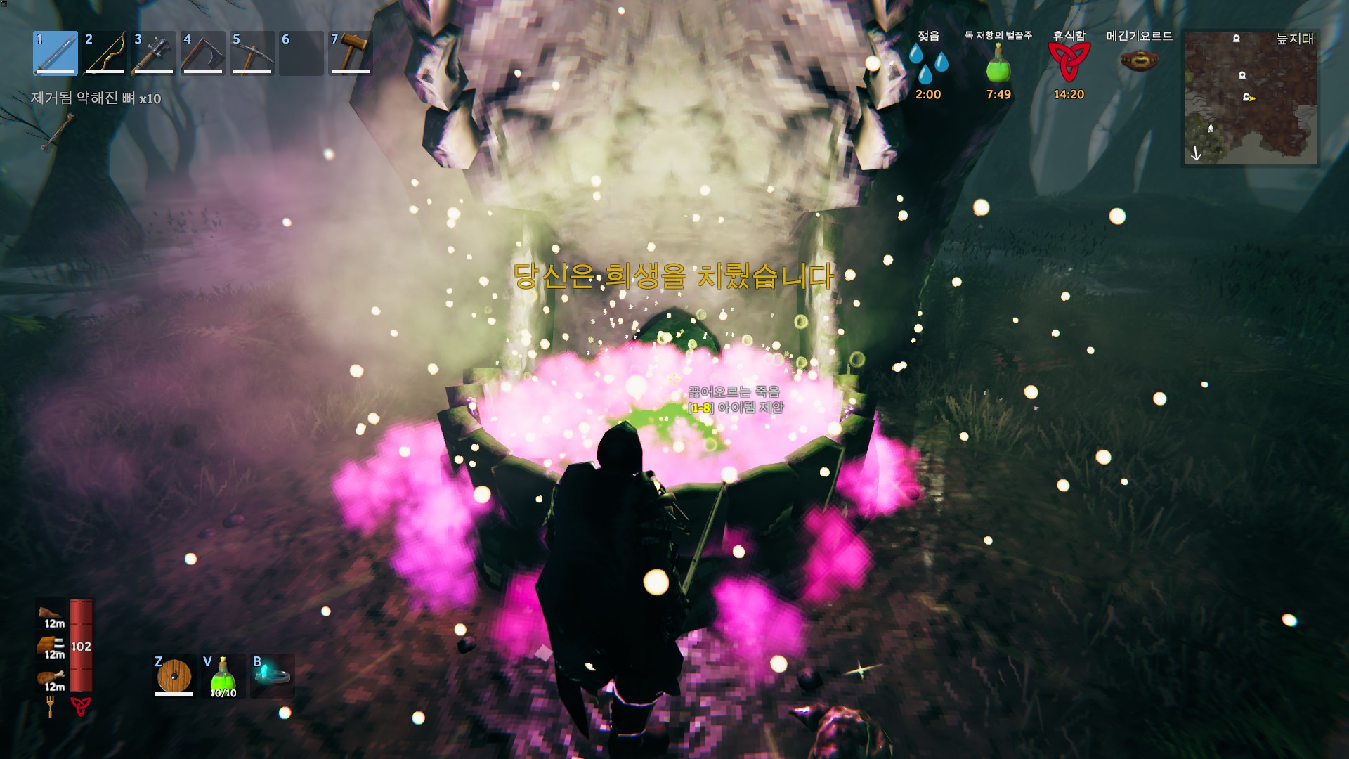 덧, 늪지대는 가기 싫은데, 여기서 만들 수 있는 무적에 가까운 화살을 만들고 업그레이드하려면 웬 나무 위에 달린 이상한 재질의 뭔가를 어렵게 또 곡괭이로 구해야 하는 걸 생각하면 고통의 지형입니다.