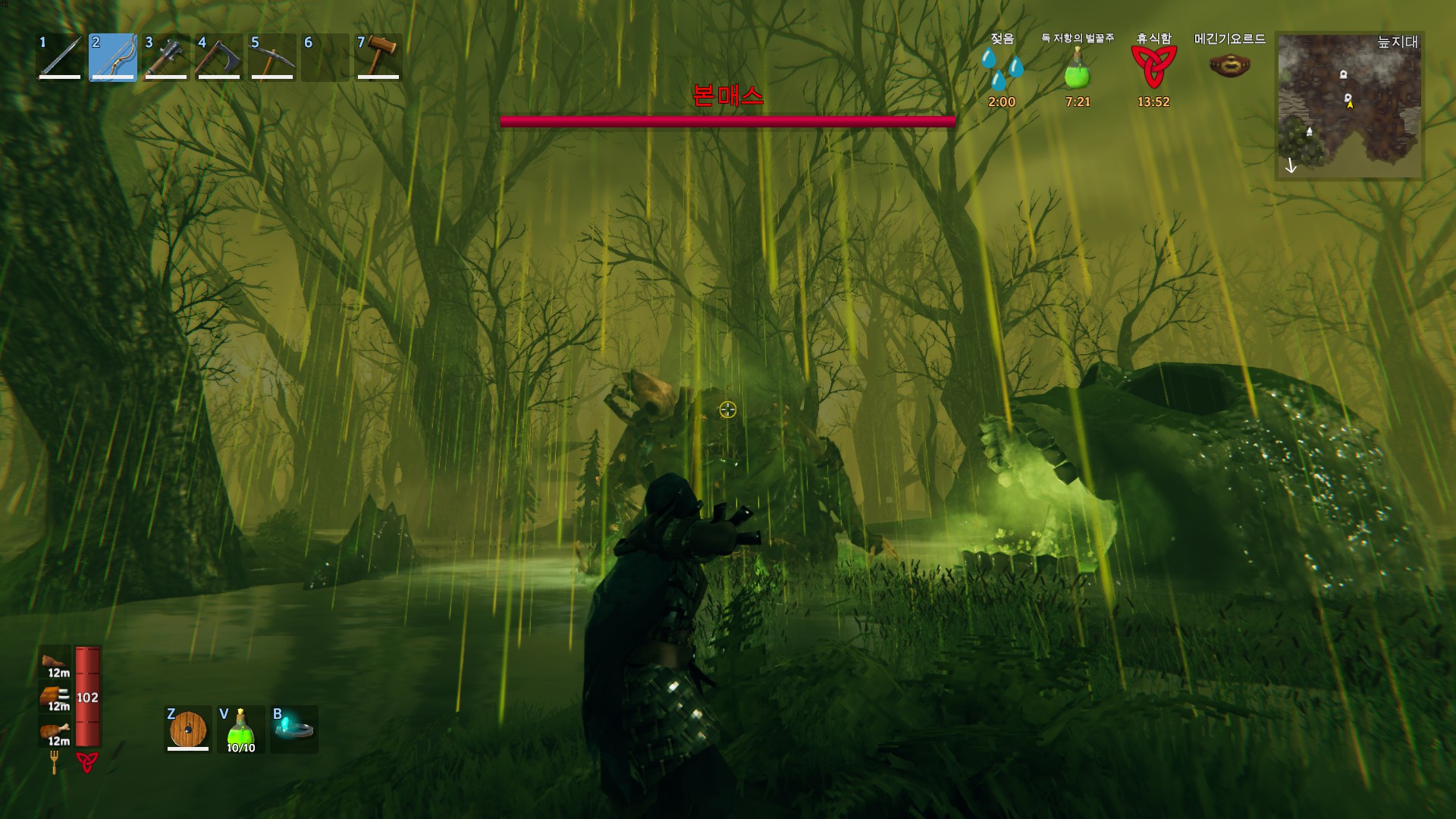 두 번째 엘더를 불화살로 어떻게든 잡고 나면 이제 좀 더 많은걸 만들 수 있는 시기가 되고, 세 번째 보스 본 매스를 잡으려면 늪지대를 돌아다녀야 하는데, 이 늡지대가 정말 Valheim 내 모든 맵 중 가장 정신적으로나 육체적으로나 힘든 지형이기 때문에 많은 노력을 들여야 합니다. 그래서 가마솥에 발효통 ( 재료가 미친 듯이 들어갑니다 )에 독 저항이나 냉기 저항 등등 여러 벌 꿀주를 만들어야 합니다.