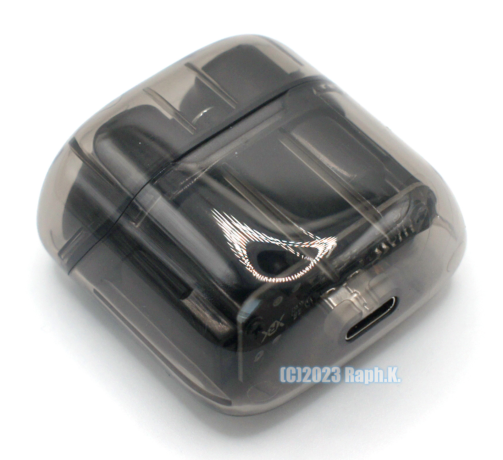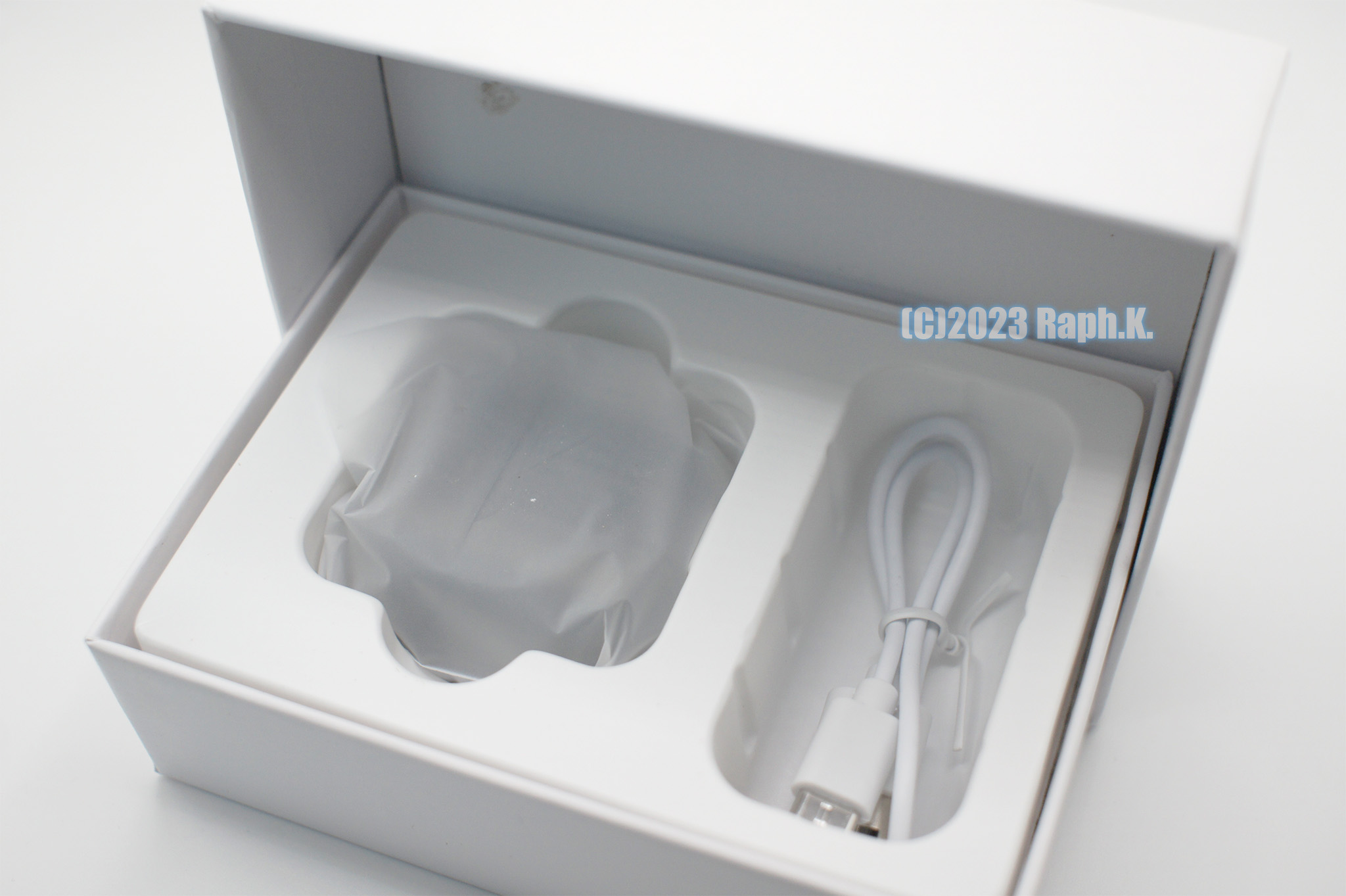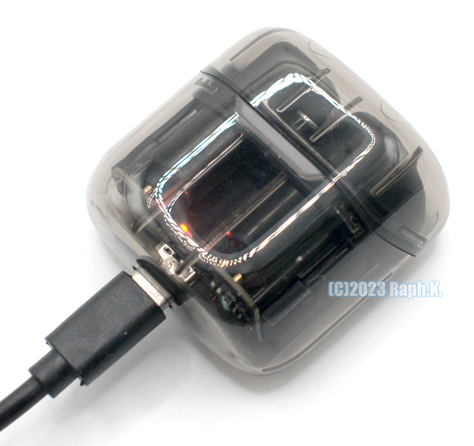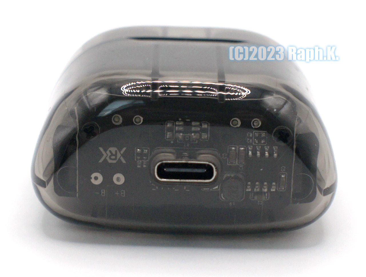 배터리는 보이지 않게 안쪽 2중 케이스에 숨겨져 있으나, 충전 포트나 충전 관련 PCB 등은 살짝 내부를 볼 수 있도록 디자인되어 있습니다. PCB에 찍혀 있는 R 은 Right의 R 은 아니고, 실제 제조사 로고로 추측되며, type C 포트로부터 들어오는 5V 전압을 충전하기 위한 간단한 PMIC 회로 구성이 보이는 것이 특징입니다. 제조사 로고 위쪽 (사진상으로 하단) 엔 배터리 +,- 연결부가 보이는데, 실제 배터리는 여러 가지 이유로 안쪽 케이스 부분에 다시 한번 숨겨져 있도록 되어 있습니다.
