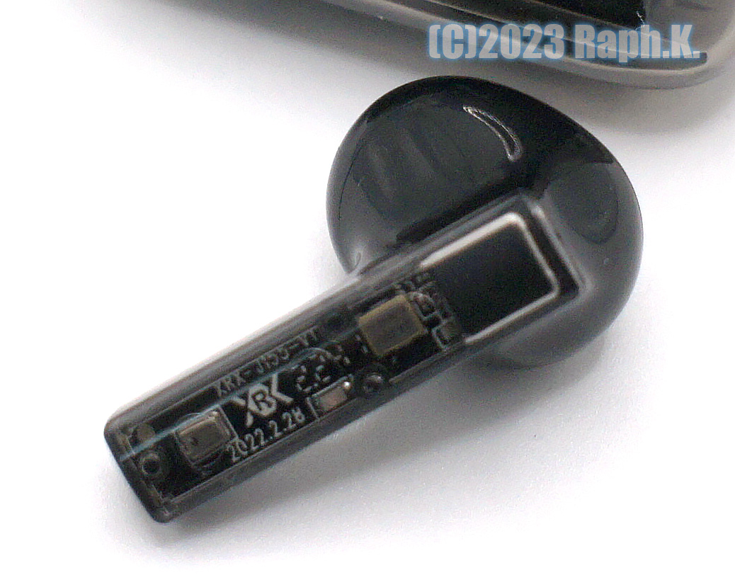 이번에 구입한 제품은 때가 타도 표시가 안 나거나 모르는 검은색이며, 하얀색이나 주황색 또는 형광녹색? 도 있어서 판매자에 따라 색상차이가 좀 있긴 하지만 다양한 색상을 취향대로 고를 수 있는 점도 아마 이 제품이 가진 매력 중 하나 일 듯합니다. 스피커 유닛은 꽤 완성도가 좋게 만들어져 있으며, 유닛 자체도 PCB 가 일부 보이도록 반투명의 폴리카보네이트로 예상되는 재질을 사용하고, 터치영역이 몸통이 아니라 스피커 유닛 쪽이라 장착 중이나 착용 후 조금만 얼굴이 움직여도 오동작하는 저가 제품과 확실히 차이가 있는 구성입니다.