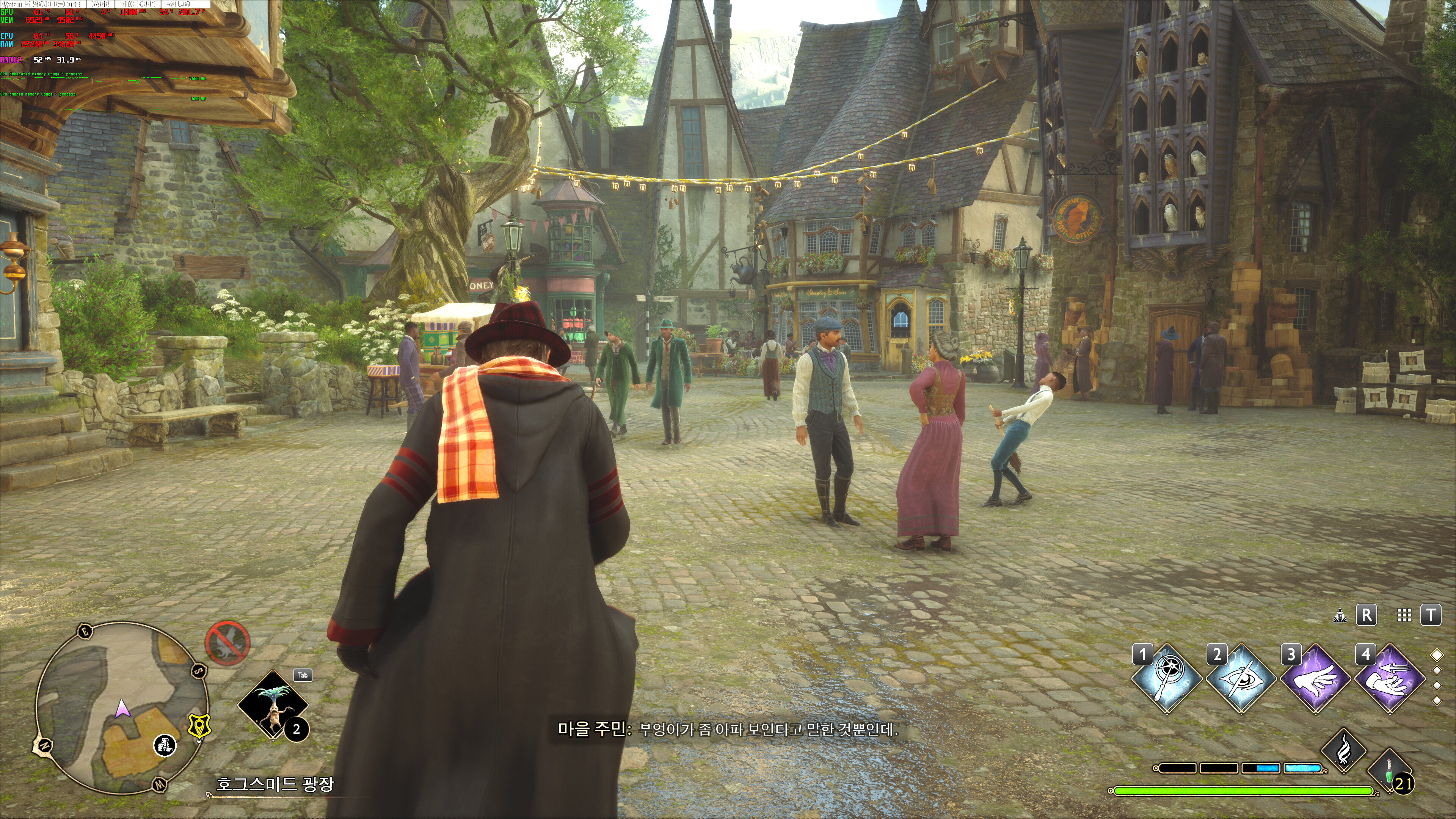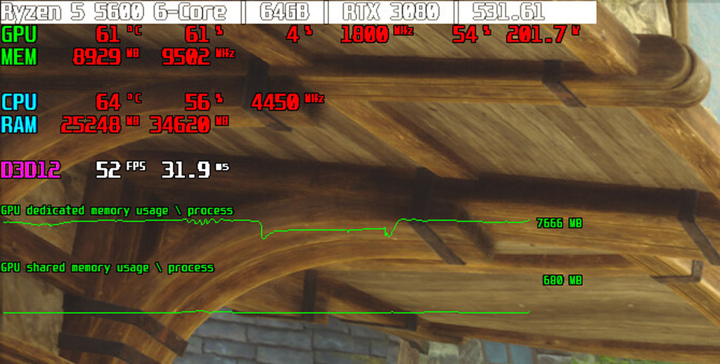 RTX3080 으로 4K 해상도 75 fps를 목표로 비동기 설정을 해도 호그스미드 낯시간대 NPC들이 가장 많은 시간에 방문할 경우 200W 정도 목표로 언더볼팅을 한 상태라면 아마 50 fps로 떨어지는 건 기본이고 많이 움직여 대면 47 fps 까지도 떨어지니 아마 호그스미드+낮시간+NPC 가장 많을 때+광장 에서의 벤치마크가 3D 성능을 판가름하는 척도가 아닐까?라는 생각까지 드는 정도입니다.