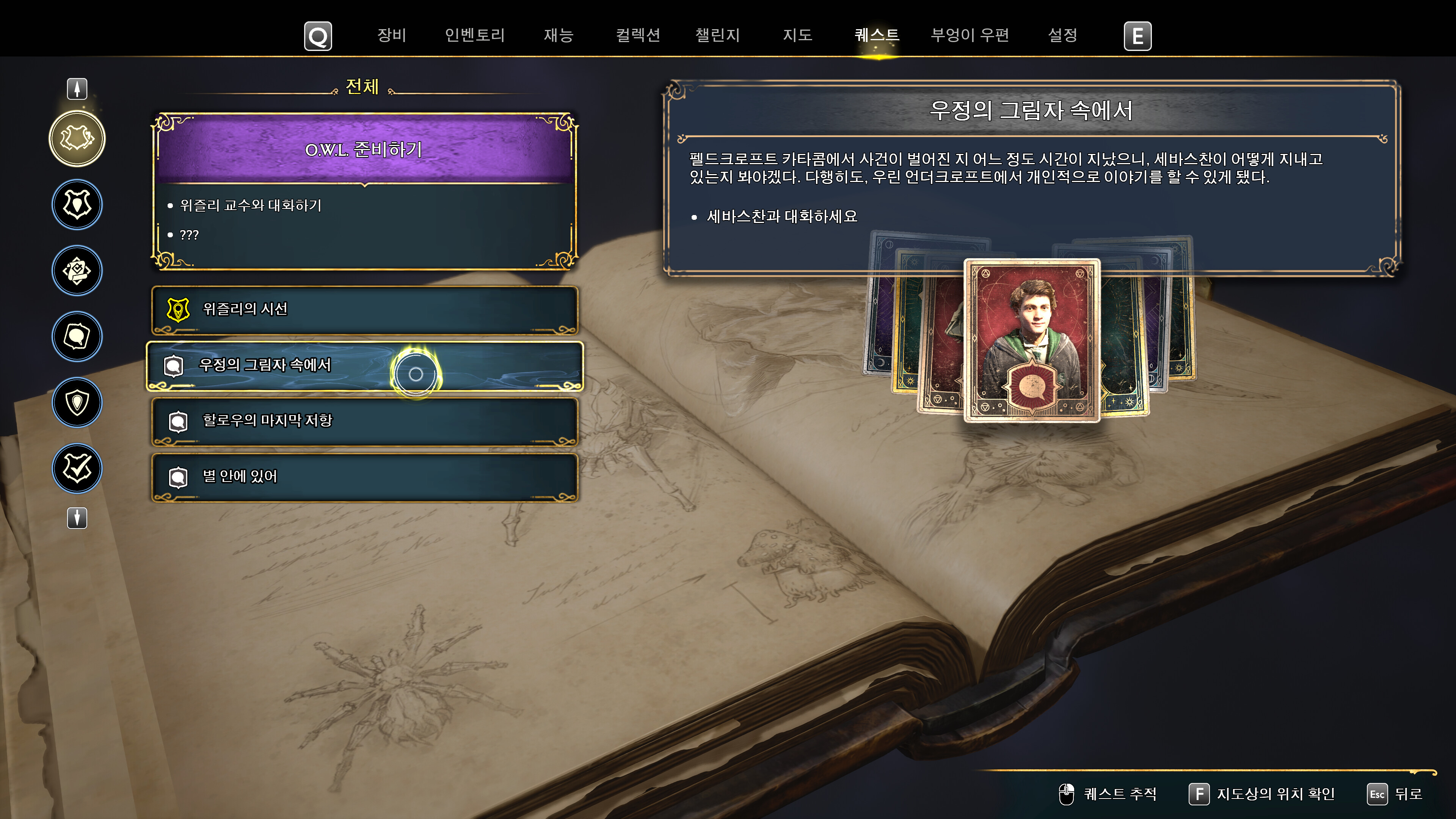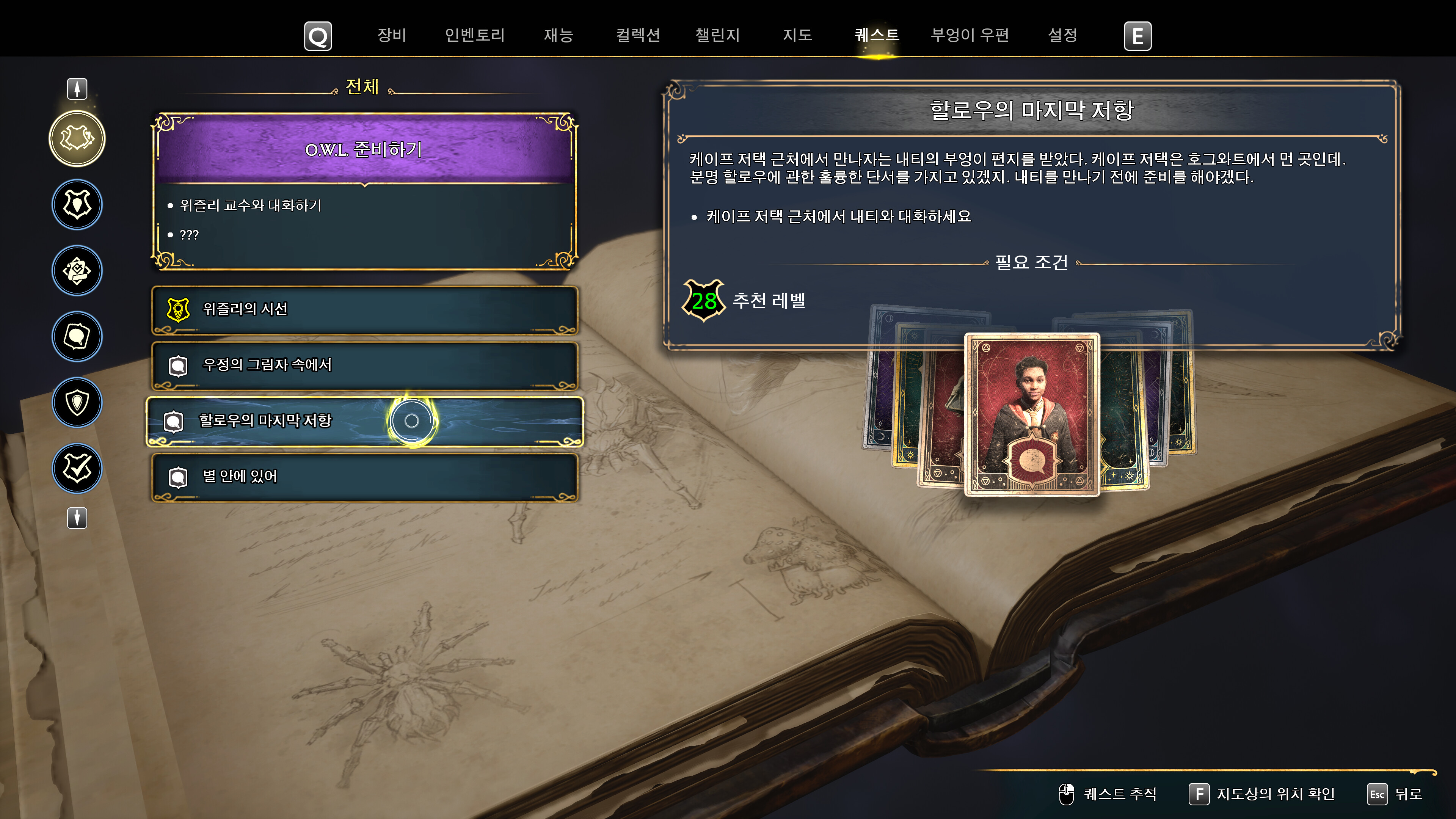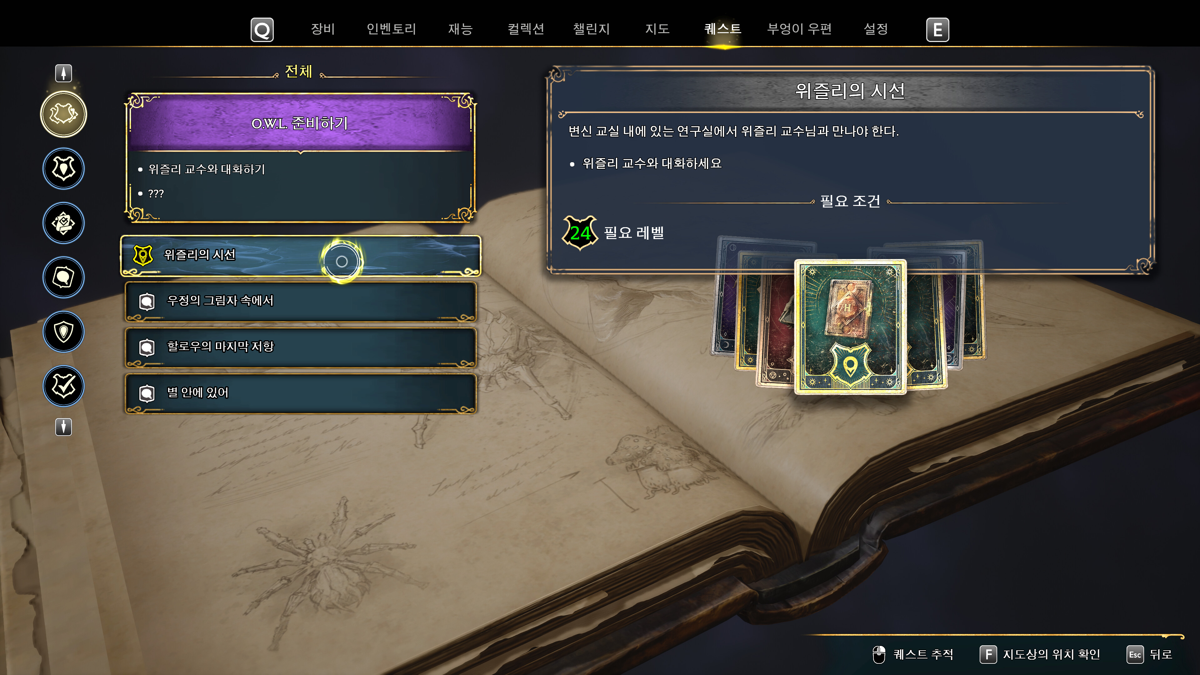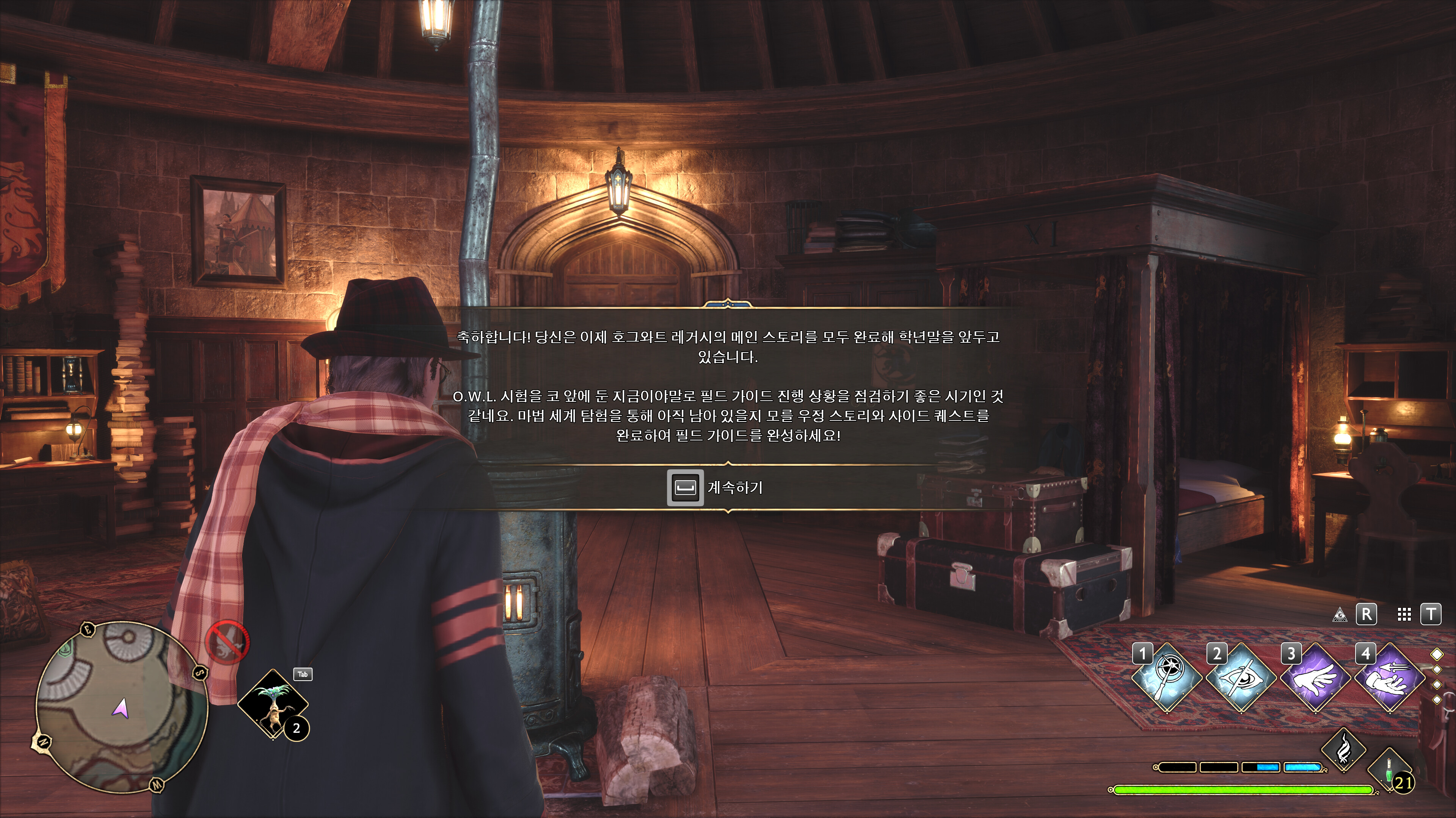 뭘 하던 주인공은 학생이고, 호그와트 졸업하려면 O.W.L 시험을 치러야 마지막입니다. 마지막 보스 잡았다고 끝이 아니기 때문에 이때까지 갑자기 전멸한 작은 퀘스트들이 마지막 보스를 잡으면 다시 나오기 시작합니다. 드디어 스토리상 여정은 100% 를 찍었으나, 모든 퀘스트를 깨려면 "넌 아직 못 지나간다"인 격입니다.
