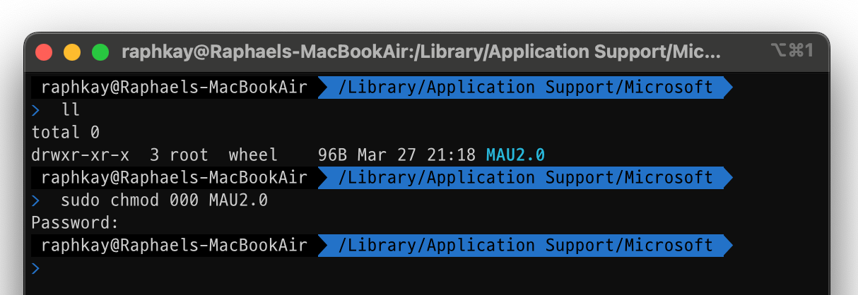 먼저 터미널을 하나 연 다음, "cd /Library/Application\ Support/Microsoft"를 쳐서 해당 디렉터리로 이동합니다. 그리고 "sudo chmod 000 MAU2.0"을 쳐 준 다음 로그인 시 사용하는 암호를 한번 쳐 주고 엔터를 치면?