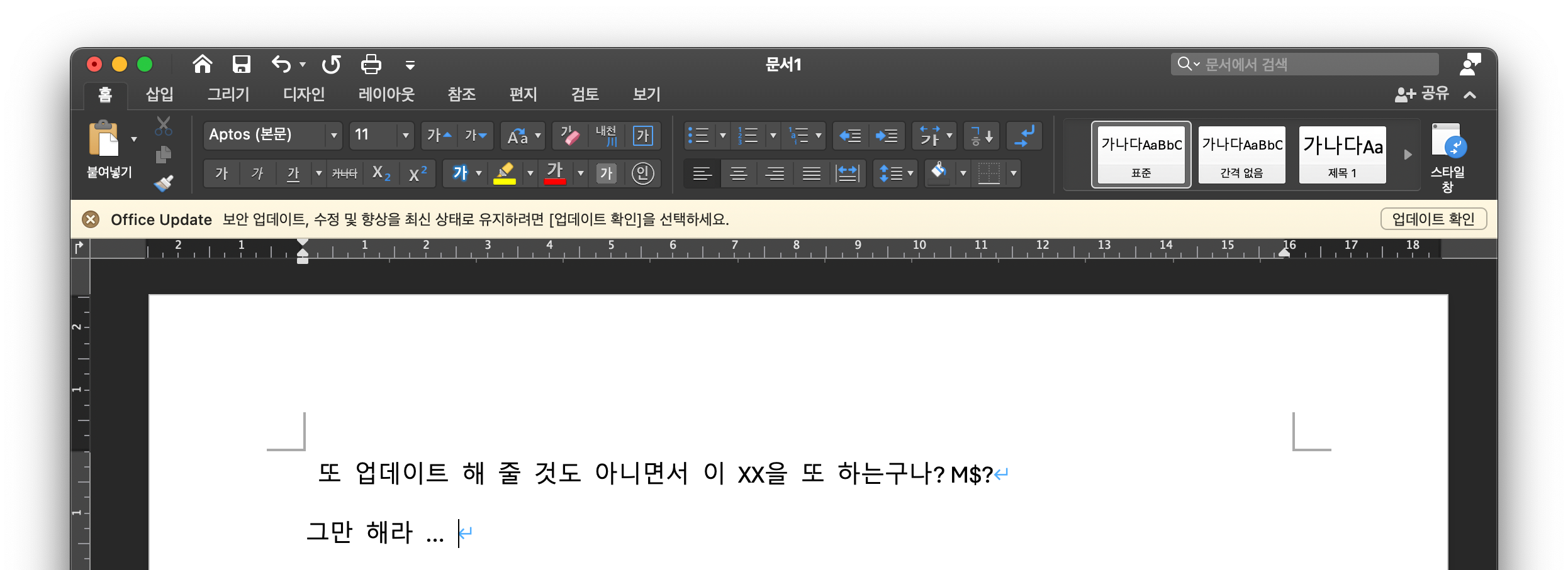 이전 MS Office 2016 버전에 이어 이젠 2019에서도 업데이트 안 해 주면서 또 업데이트하라고 강요하는 그 극혐의 노란색 업데이트바가 뜨기 시작 했습니다.