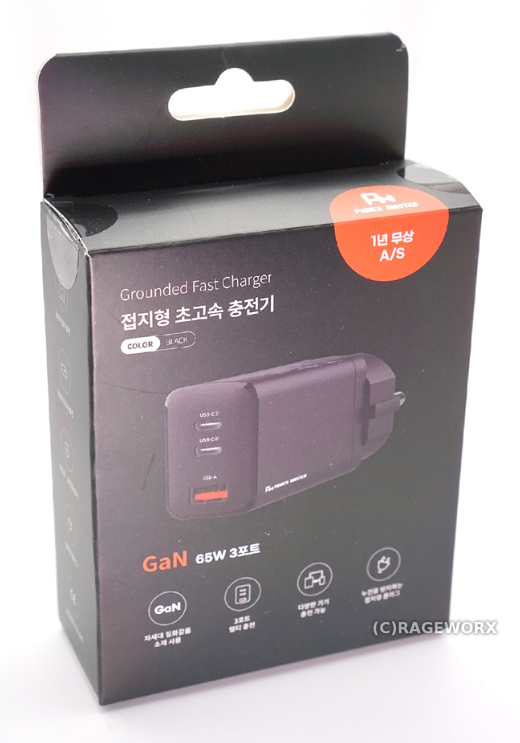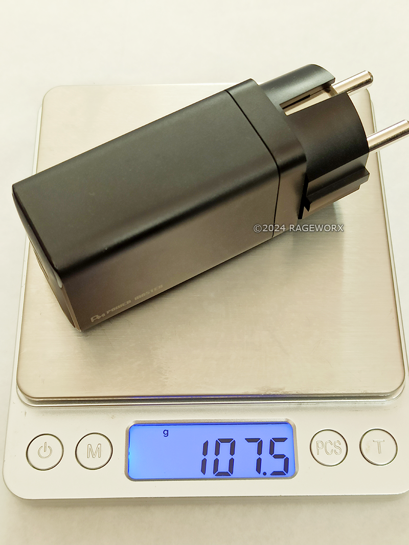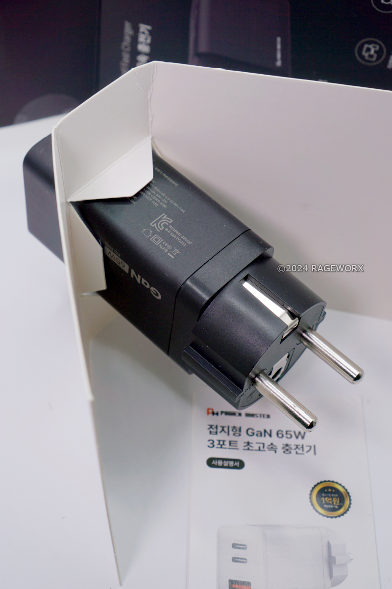 제품의 무게는 대부분 GaN 충전기들이 요즘 다 작게 나오기 때문에 크게 무겁기 않습니다만, 한국형 접지 플러그 때문에 미국/일본, 또는 유럽형 충전 단자 보다 조금 더 무게가 나가는 걸로 알고 있습니다.