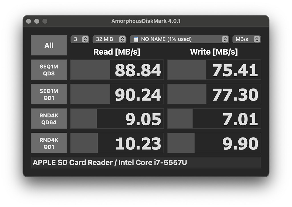 내장 SD 리더기에서 이런 성능이 나온다면, 과연 어떤 제품이길래 5천 원짜리 32GB 에서 이런 성능이 나오는 건지.. 쓰기 속도가 32 MiB 파일 쓰기에서 75.41MB/s로 연속 쓰기 QD8에서 이 정도면 놀라운 성능이 아닐 수가 없습니다. 물론 이런 성능에 그만큼 수명도 따라줘야 할 듯합니다만, 이런 부분은 시간이 좀 더 지난 상태가 돼야 알 수 있을 듯합니다.