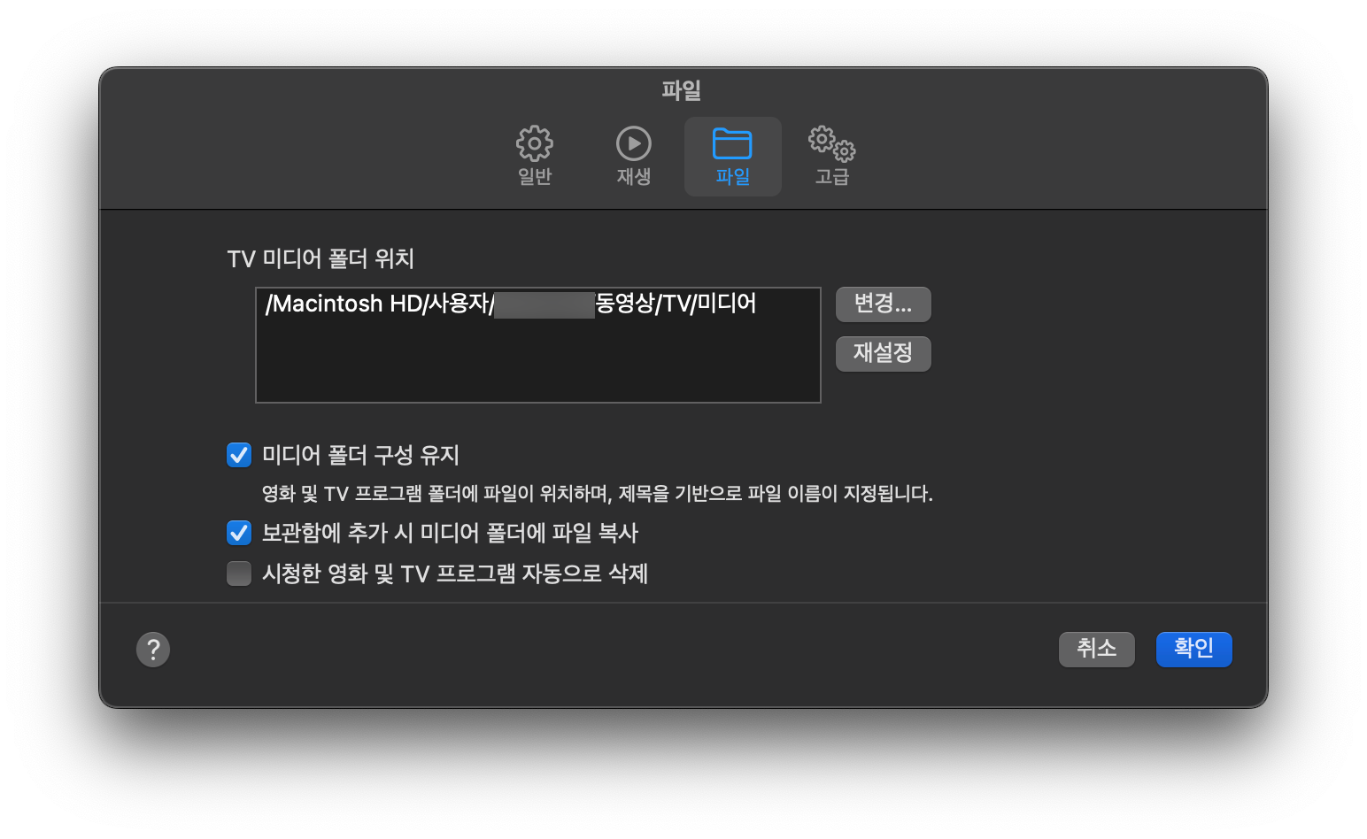 - AppleTV > 설정 > 파일 탭>TV 미디어 폴더 위치>변경...