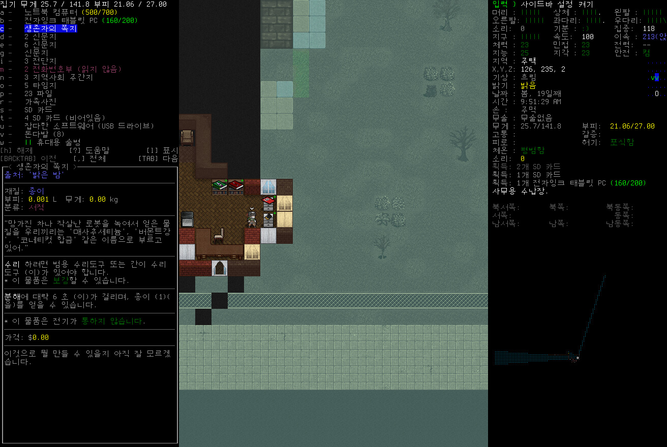 특히 "좀보이드"와 배경적으로 다른 점 하나는, 시기가 "근미래"라는 점 (좀보이드는 1900년대)이다 보니 다양한 배터리로 구동되는 전자기기가 많이 등장하고, 이와 달리 종이에 쓰인 많은 소소한 재미들도 제공한다는 점입니다. 이런 경우 e 키로 주변 아이템을 확인하면서 상태창에서 관련 내용들을 읽을 수 있는데, 대충...